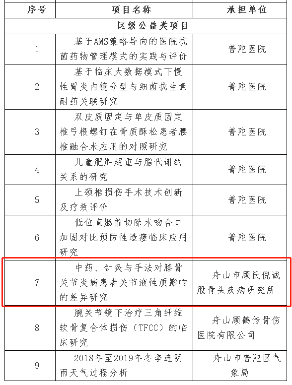 我院《中藥、針灸與手法對膝骨關節(jié)炎病患者關節(jié)液性質(zhì)影響的差異研究》被納入2019年度舟山市普陀區(qū)科技項目。